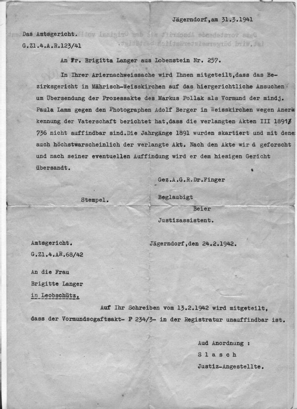 ST: I’ll start first of all her name is Brigitte Langer and she was born in 1915 in Jagerndorf which is, which was then, part of the Austrian empire. Three years later, [at the end of] World War One, the land was all divvied up and I have to explain the history to you to give an understanding of what happened leading up to the war. The Czechs were given the rights to the lands that she lived in, even though they were Czech speaking and the majority of the people in the area where she lived were German speaking. And this caused a lot of aggravation, probably because of The Depression and inflation and all the terrible things that happened after the First World War. So the seeds of unrest that were sewn as a result of all this kept going and eventually a leader called Heinlein, who embraced the Nazi ideology, went to Hitler in the’30s and asked for help and this gave Hitler the excuse to invade, to try to invade Czechoslovakia because he was taking back these Sudeten German lands. The Sudeten Germans self styled themselves that.